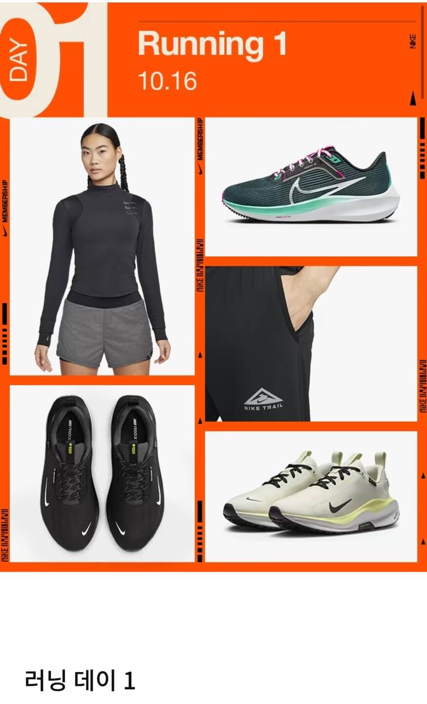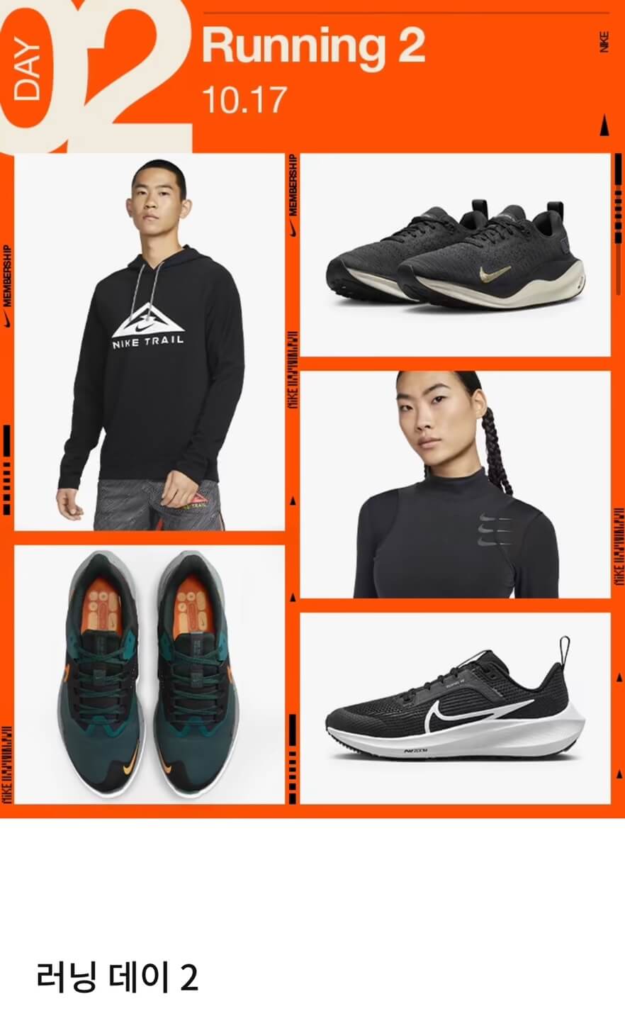 첫째 날과 둘째날은 러너들을 위한 날입니다. 때마침 나이키에서는 런 유어 런 챌린지를 통해 10월 12일부터 31일까지 러닝 크루들과 42,195km를 달성하는 챌린지도 진행 중입니다. 저도 헬스장에서 러닝을 하고 있어서 챌린지에 참여했습니다. 관심이 있는 분들은 한번 동참해 보시는 게 어떠신가요?