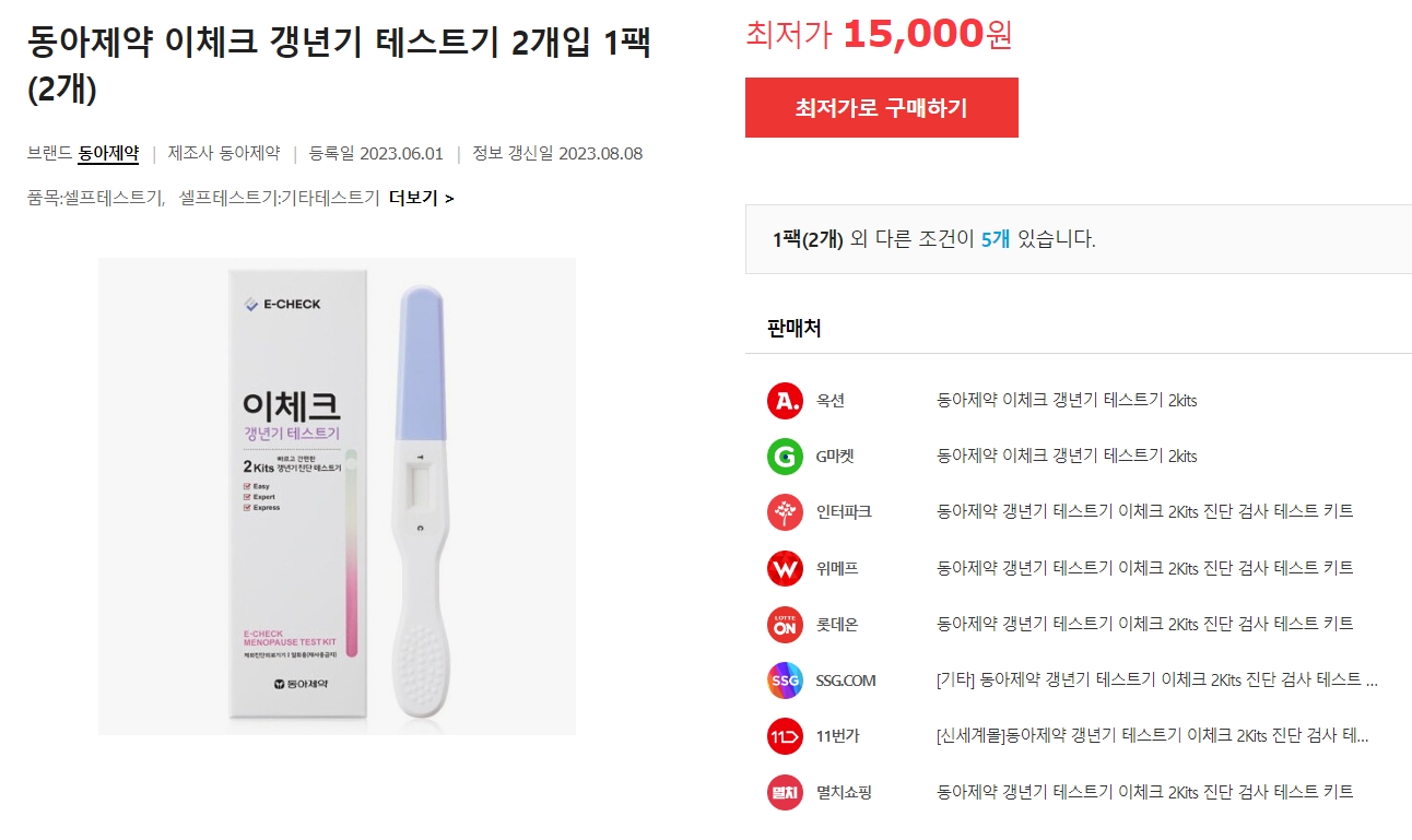 갱년기 진단키트로 검색해보니 이 제품이 뜨는군요. 인터넷 최저가는 2개들이에 15,000원입니다. 이체크는 갱년기 테스트기로 '의료기기'에 해당합니다.
