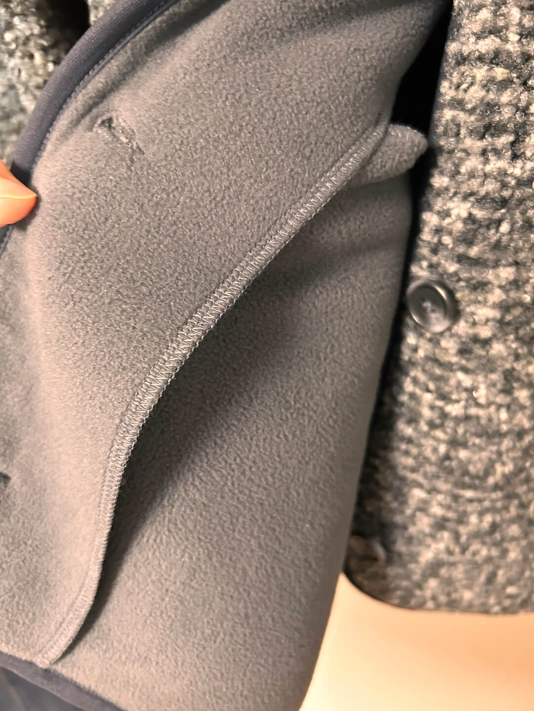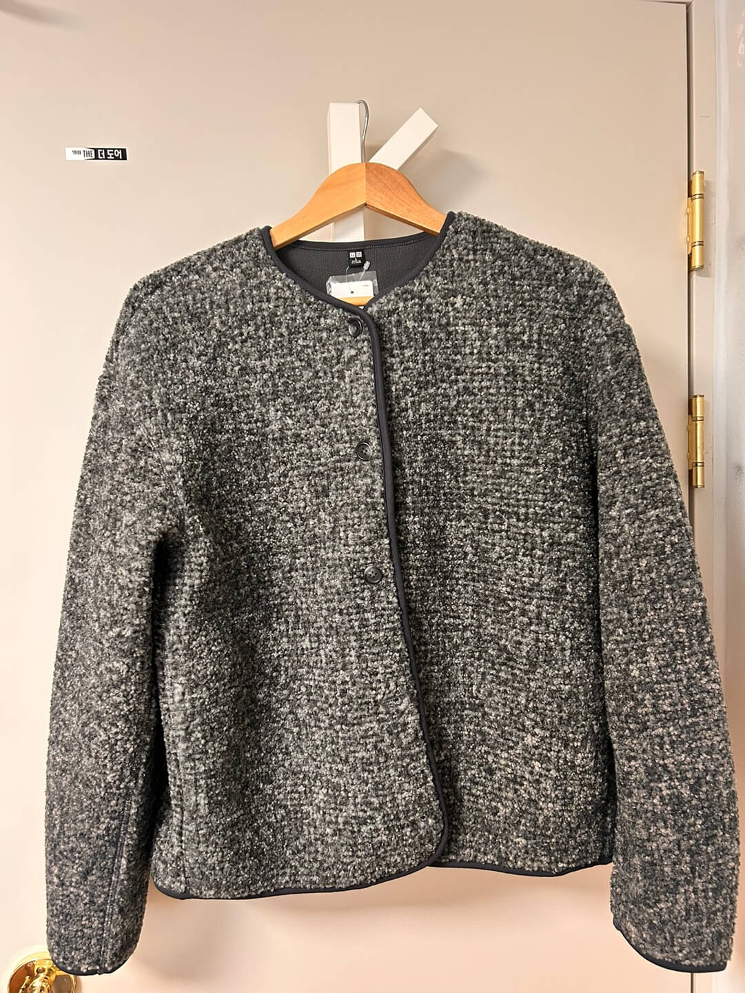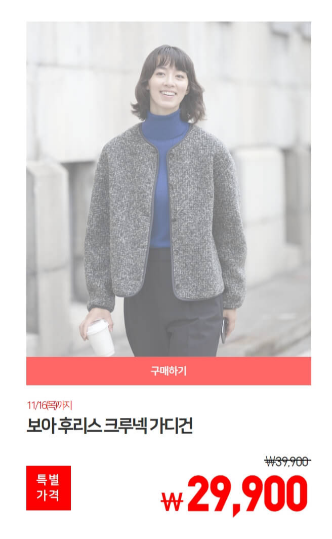 마지막으로 집 근처 마실 나갈 때 입으면 좋을 듯한 보아후리스크루넥가디건(세일가 29,900원)도 마침 세일 중이라 입어보고 구매했습니다. 겨울옷이라 넉넉하게 입는 것을 좋아해서 L 사이즈로 구매했습니다. 재질은 마치 약간 겨울용 카펫(?) 같은 느낌으로 안감은 다른 소재로 마감되어 있어서 매서운 겨울바람을 잘 막아줄 것으로 보입니다.