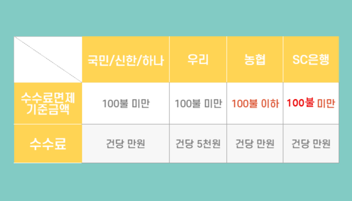 통장을 주거래 은행이 아닌 곳에서 만들었다가 매번 달러를 옮기려고 한다면 이 또한 이체 수수료가 발생하기 때문에 결론적으로는 지급수수료를 아낀 게 아닌 것이 됩니다. 차라리 지급 금액을 높여서 지급 시기를 늦추고 수수료를 떼더라도 주거래 은행에서 받는 것이 나중에 대출이나 다른 은행 서비스 우대 항목에서 플러스가 되기 때문에 그 방법을 추천드립니다.