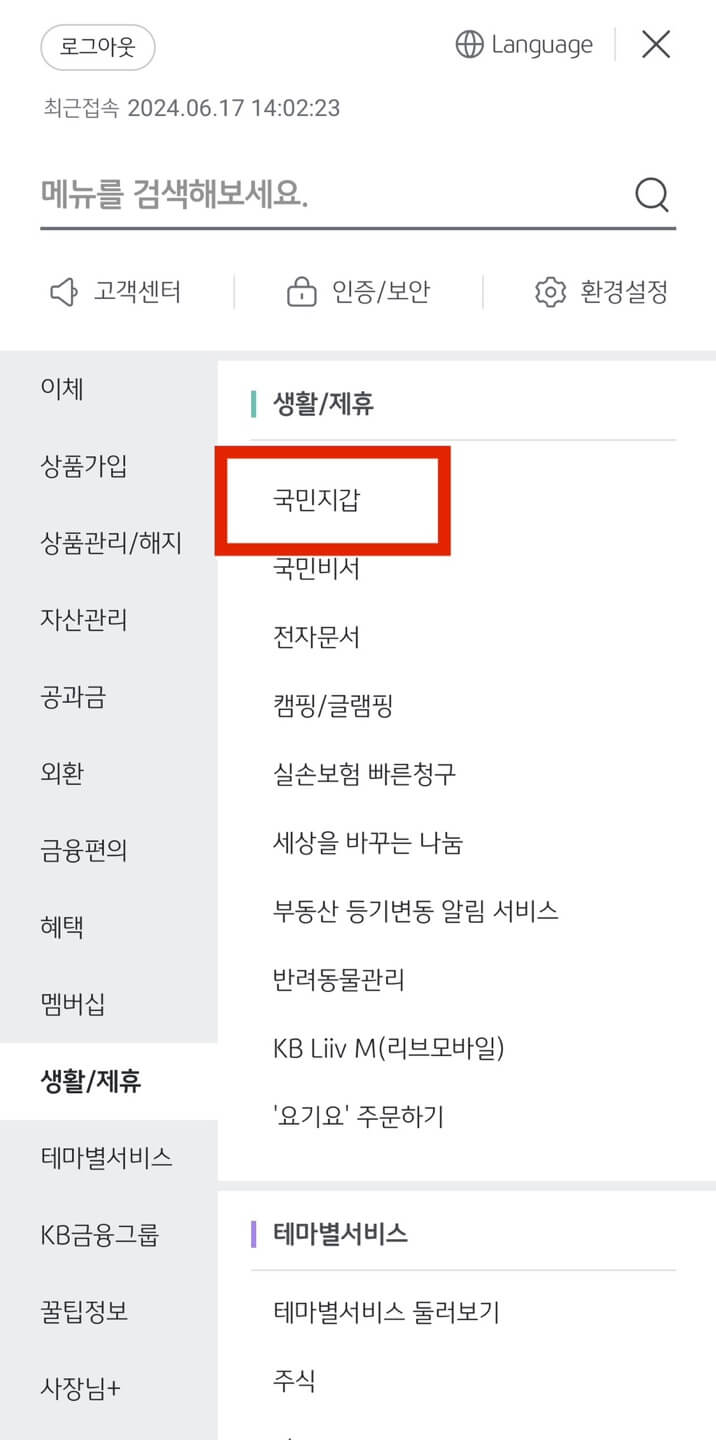 왼쪽 분류에서 생활/제휴를 클릭한 뒤 국민지갑을 선택합니다.