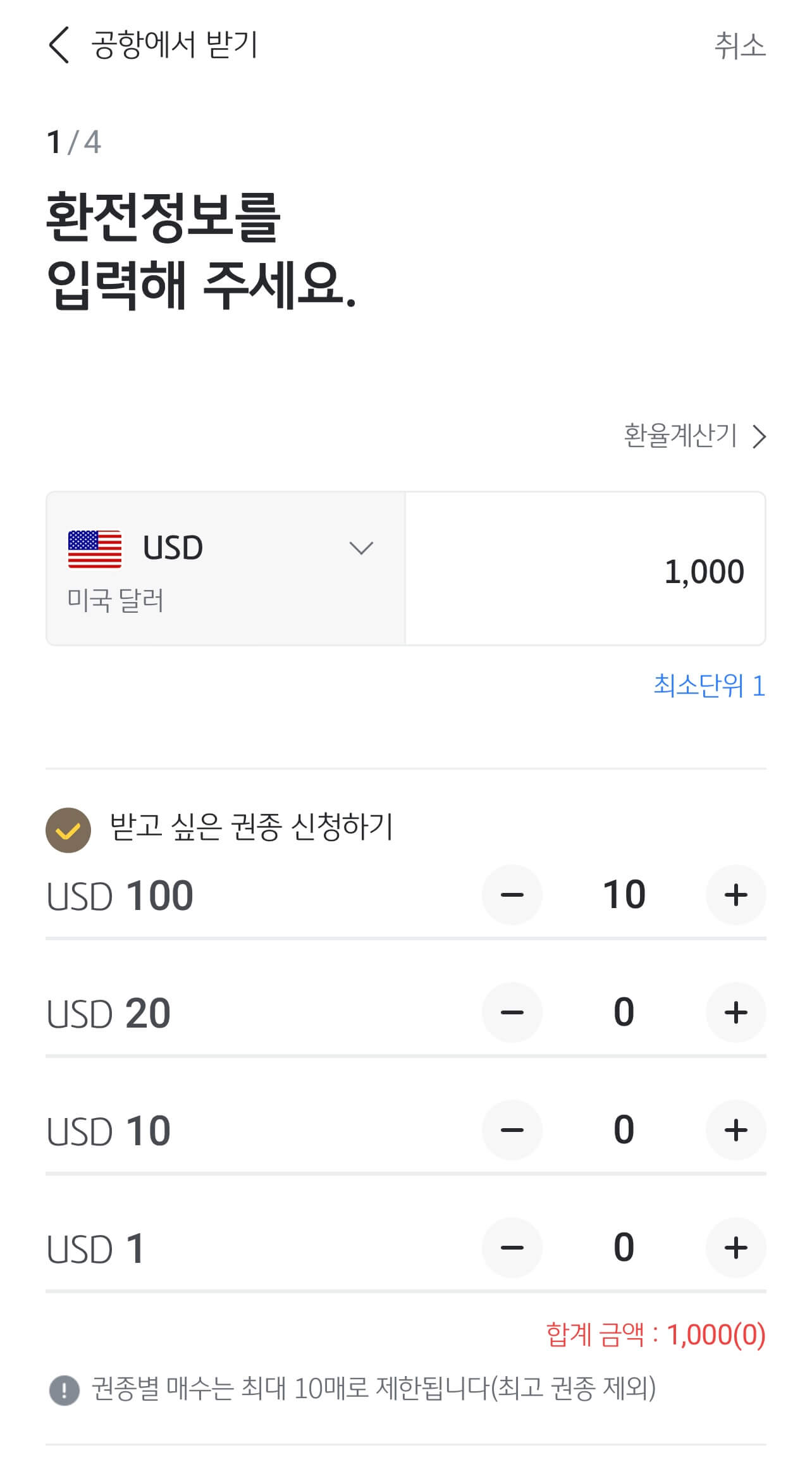 달러의 경우에는 권종을 미리 선택할 수 있습니다. 최대 권종별 매수는 10매로 제한되어 있습니다.결제 예상금액을 확인하면 환율우대 100%가 적용된 것을 볼 수 있습니다.