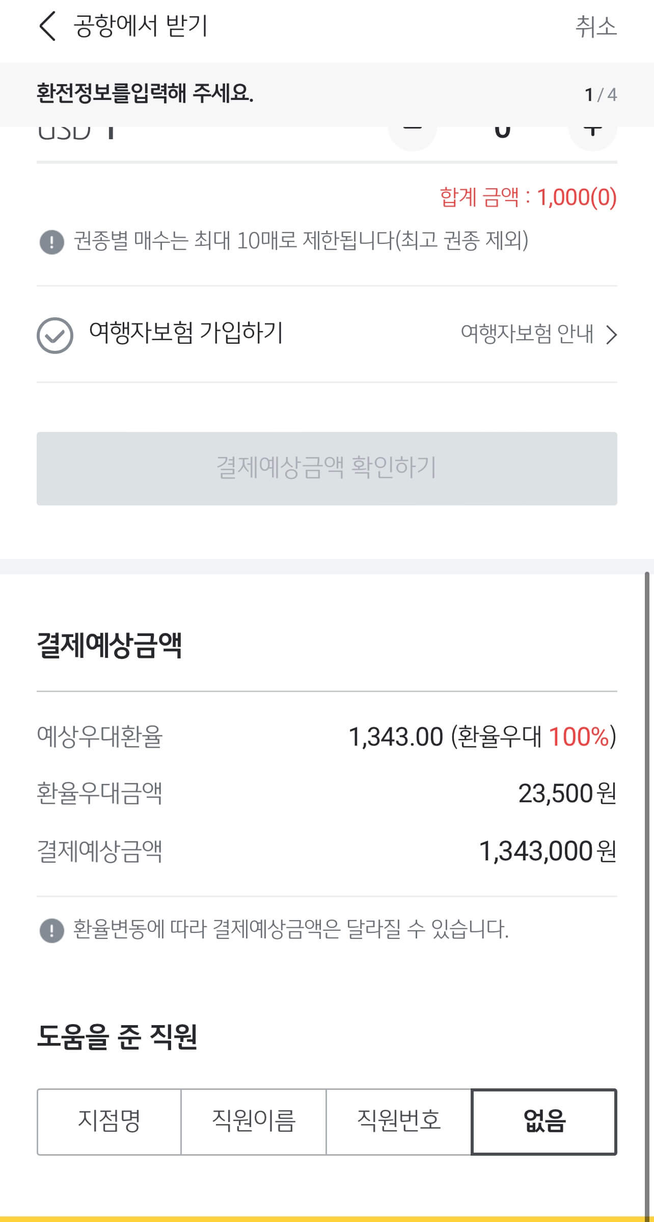 달러의 경우에는 권종을 미리 선택할 수 있습니다. 최대 권종별 매수는 10매로 제한되어 있습니다.결제 예상금액을 확인하면 환율우대 100%가 적용된 것을 볼 수 있습니다.
