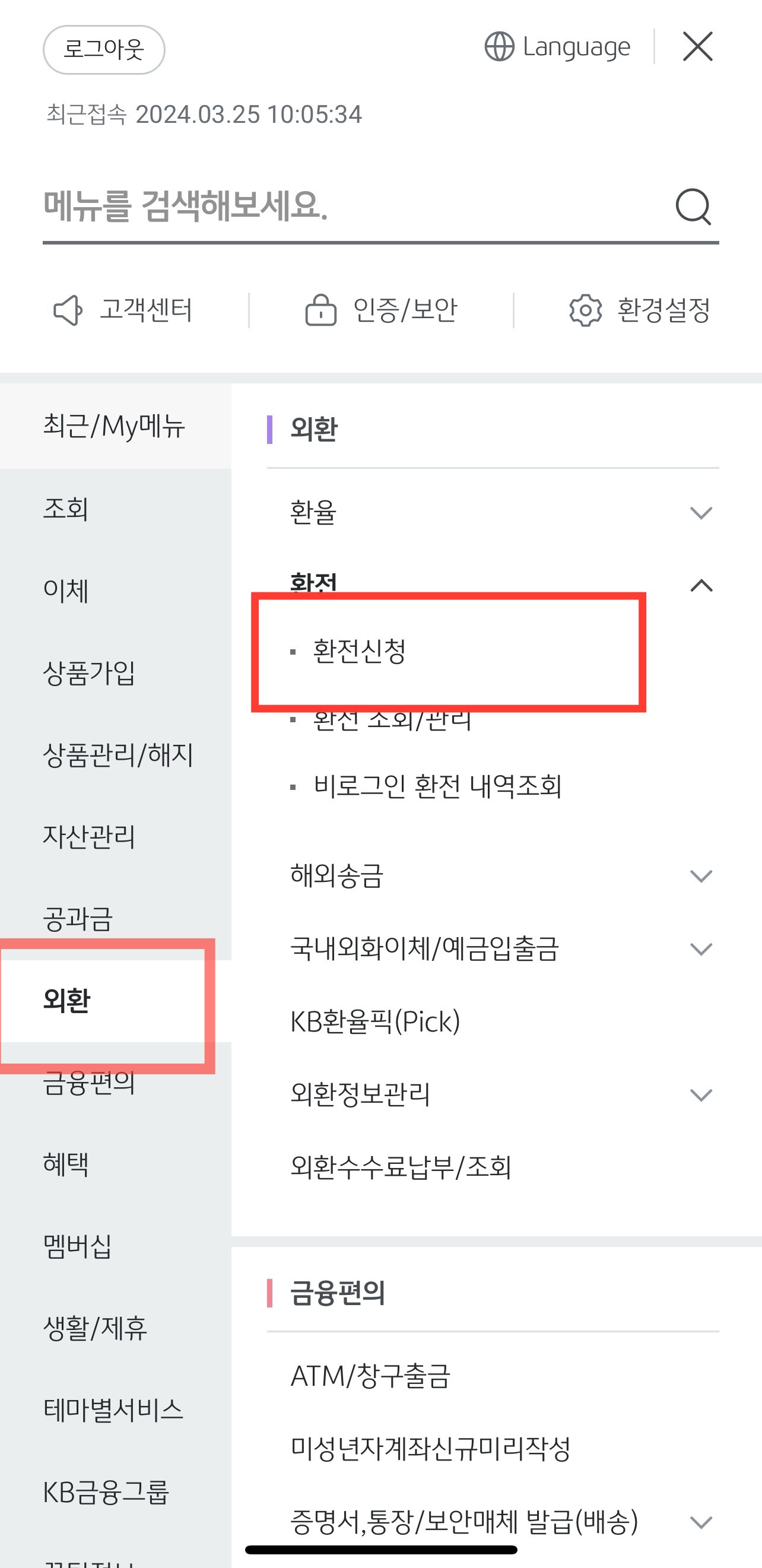 2. 메뉴- 외환- 환전을 클릭합니다.