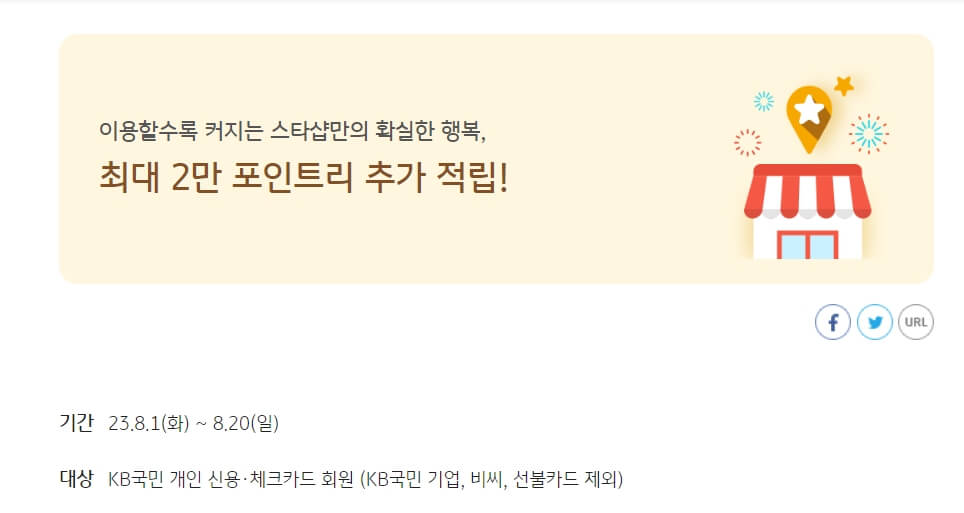 이용할수록 커지는 스타샵만의 확실한 행복, 최대 2만 포인트리 추가 적립! 기간 23.8.1(화) ~ 8.20(일) 대상 KB국민 개인 신용·체크카드 회원 (KB국민 기업, 비씨, 선불카드 제외) 내용 응모하고 전국