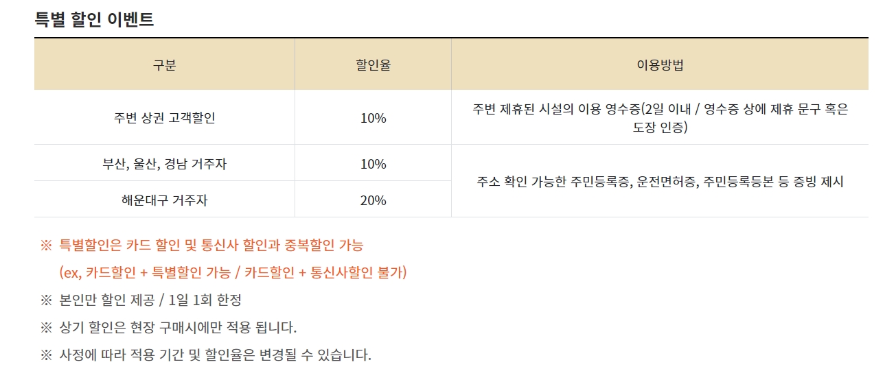 클럽디오아시스는 특별할인 제도를 운영하고 있습니다. 주변 상권을 이용한 고객 및 지역 거주자는 추가로 할인 받을 수 있는 혜택이 있습니다. 특히 해운대구 거주자는 20%나 추가 할인을 받을 수 있어서 부럽기만 합니다.