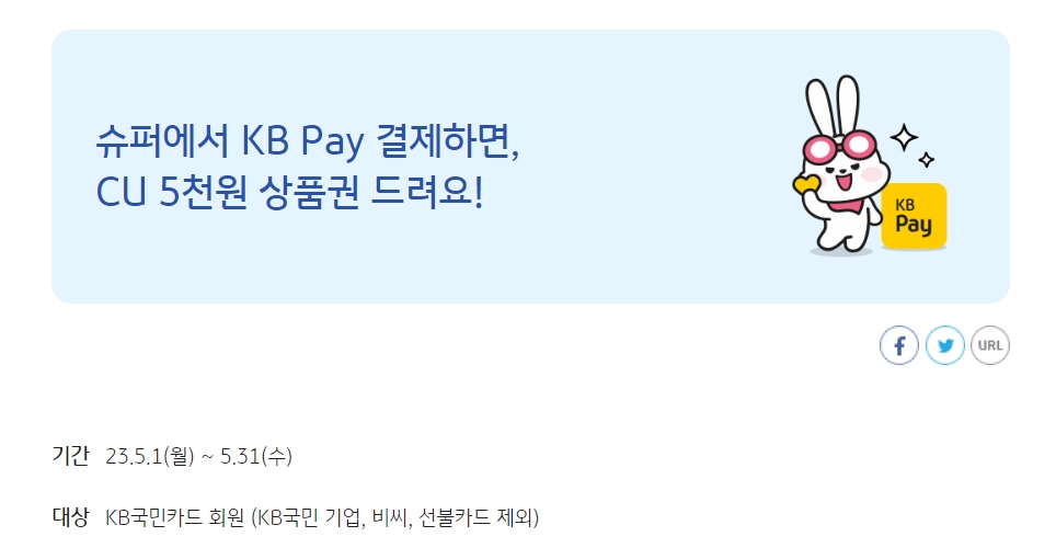 슈퍼마켓 업종(온라인 제외)에서 기간 동안 응모하고 KB Pay로 누적 6만원 이상 이용하면 CU 5천원 상품권 제공