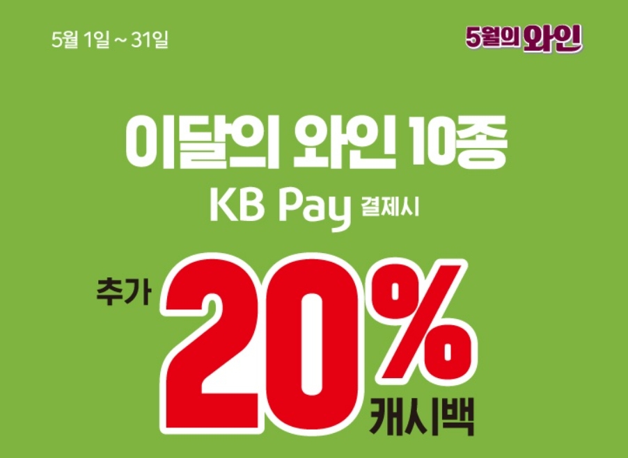 ■이벤트 내용: 이마트 24에서 이달의 와인 10종을 KB Pay로 결제하면 최대 2만 원까지 20% 캐시백을 돌려드립니다.