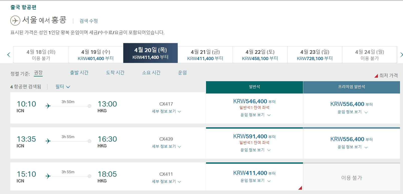 참고로, 현재(4월 18일 기준) 홍콩행 비행기 왕복 항공권 가격은 최소 40만 원대부터 시작합니다.