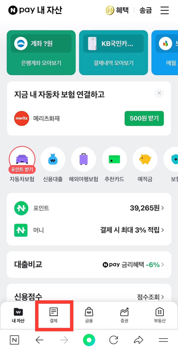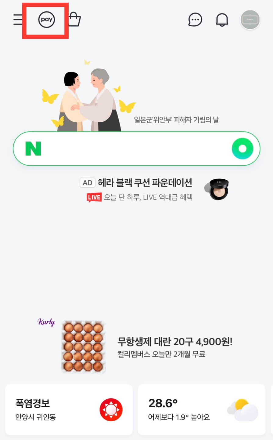 1. 네이버 앱을 열고 화면 상단의 페이 버튼을 눌러 줍니다.