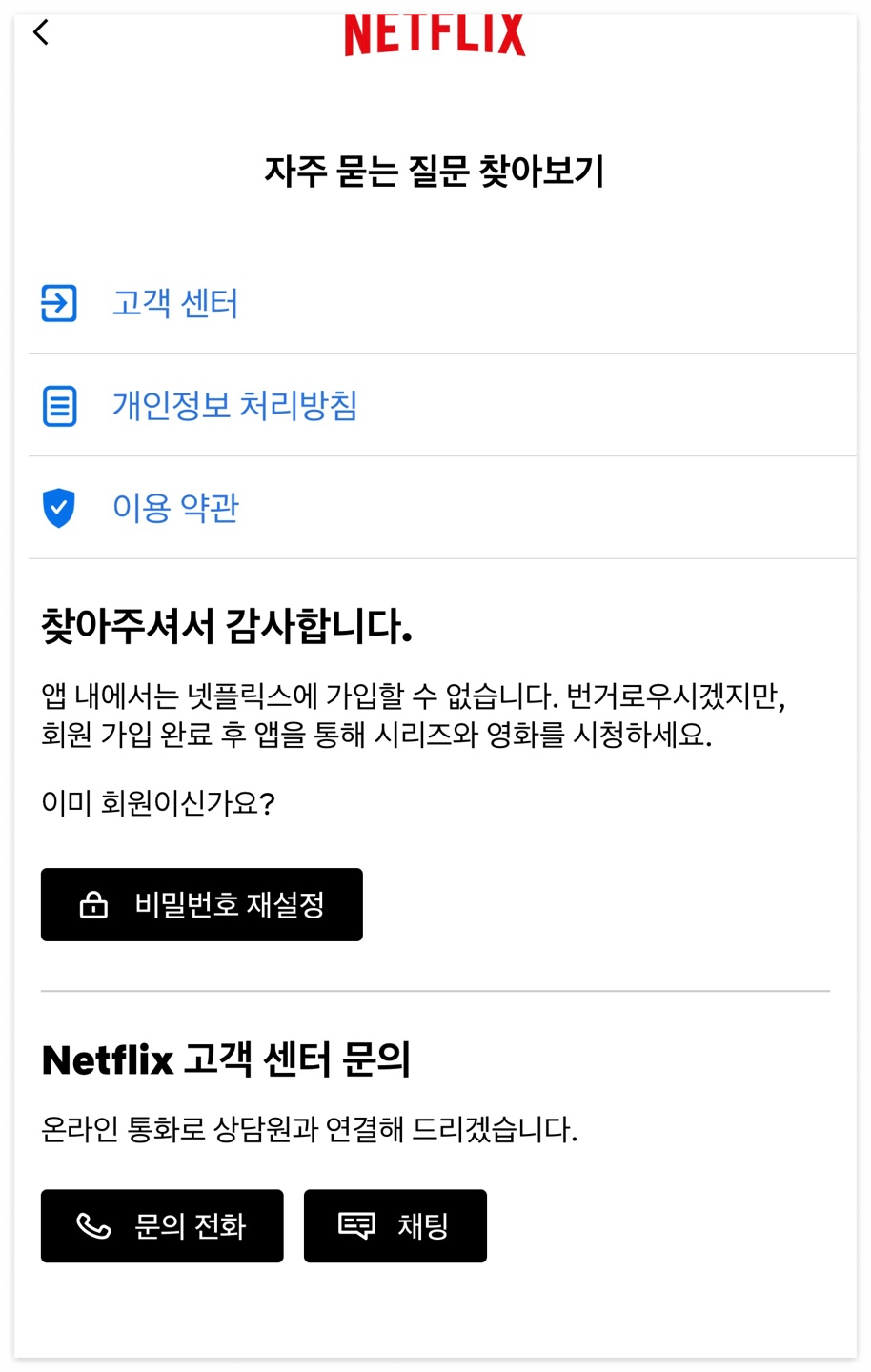 넷플릭스 고객센터: 앱으로 접속