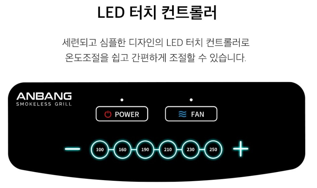 컨트롤러 부분을 살펴보면, 전원 버튼과 팬 버튼 그리고 온도를 조절하는 버튼이 심플하게 되어 있는 것을 볼 수 있습니다. 색상도 베이지 색이라 화이트 톤의 인테리어 제품을 선호하시는 분들에게도 안성맞춤인 상품이네요. 안방그릴은 베이지 색뿐만 아니라 네이비 색상도 있습니다. 개인적인 저의 선호로는 베이지가 더 이쁜 것 같습니다.