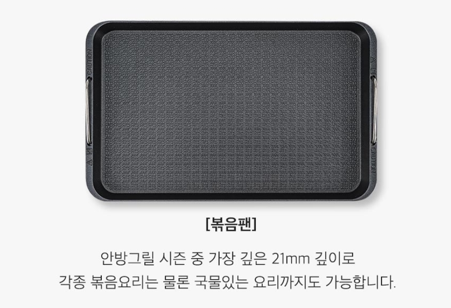 이 안방그릴은 고기를 구울 수 있는 고기팬과 볶음팬 두 가지가 제공됩니다. 안방그릴의 독특한 고기팬으로 인해 기름을 효율적으로 제거할 수 있습니다.