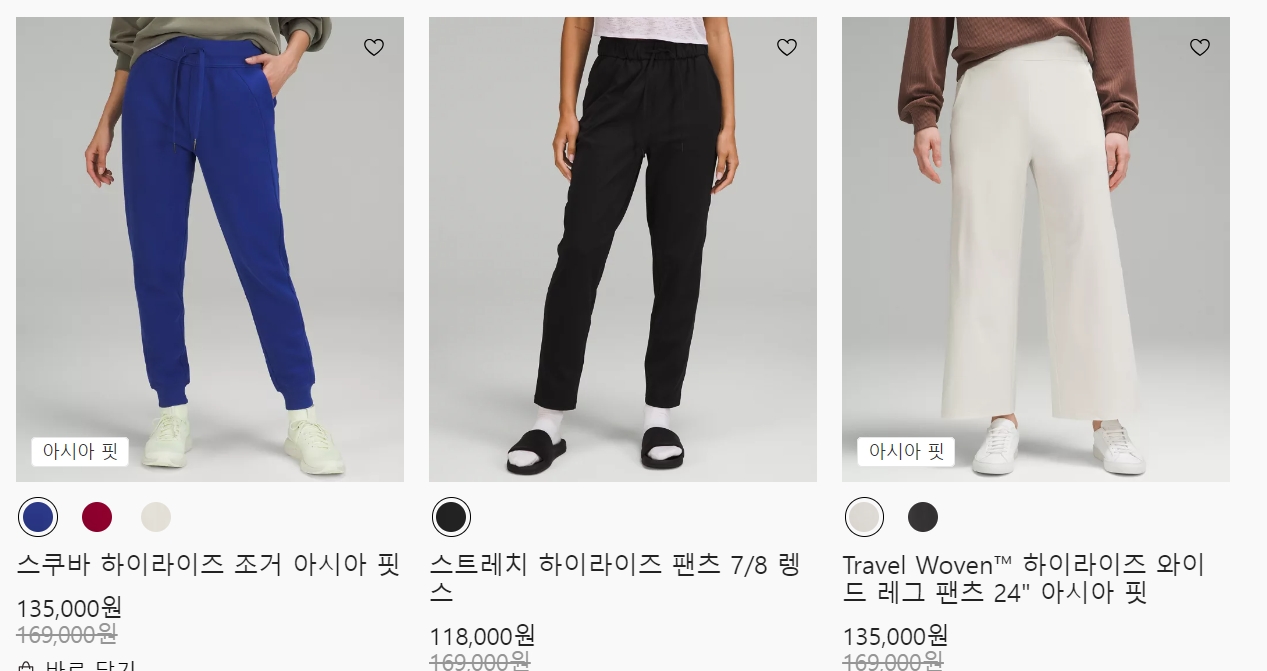 딱 달라붙는 레깅스가 부담스러운 분들은 조거를 선택하시면 부담없이 운동을 즐기실 수 있습니다. 평상복으로 입기에도 부담스럽지 않은 룰루레몬의 조거는 통기성과 뛰어난 디자인을 자랑합니다. 다양한 사이즈와 길이를 갖추고 있으나 세일기간 중에는 품절인 사이즈와 색상이 있을 수 있기 때문에 구매하시려는 분들은 서두르시기 바랍니다.