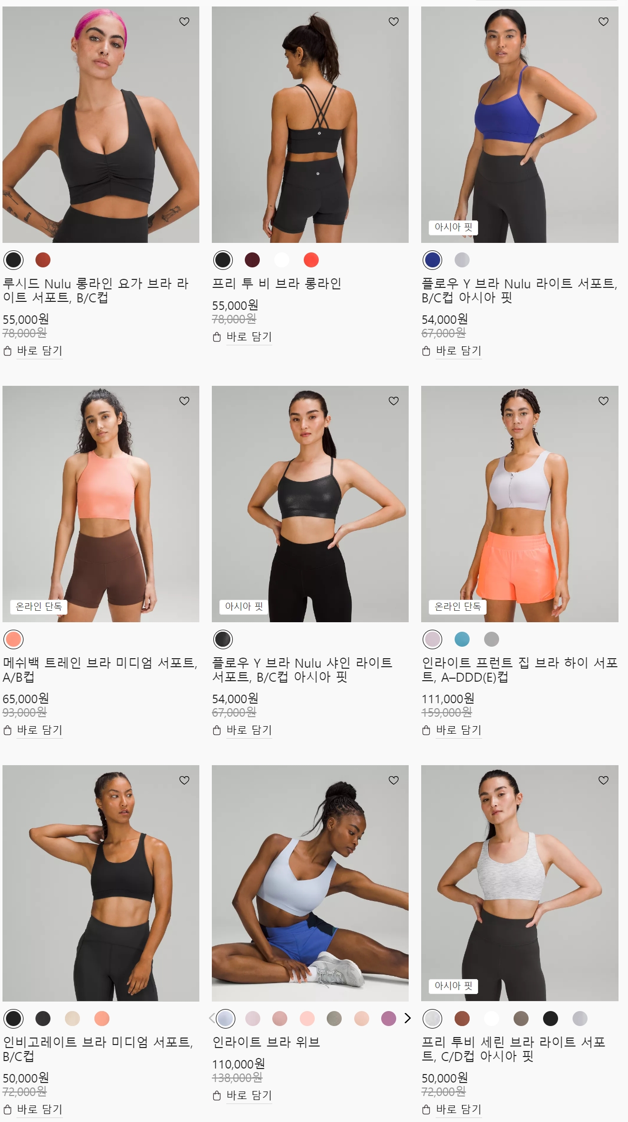 격한 운동을 하는 이들에게는 스포츠 브라의 역할이 큽니다. 적절한 사이즈의 몸을 지탱해 줄 수 있는 스포츠 브라가 없다면 운동하는 데에 지장을 받을 수밖에 없습니다. 견고하고 핏이 훌륭하기로 유명한 룰루레몬의 다양한 디자인의 스포츠 브라 또한 이번 세일 대상입니다.