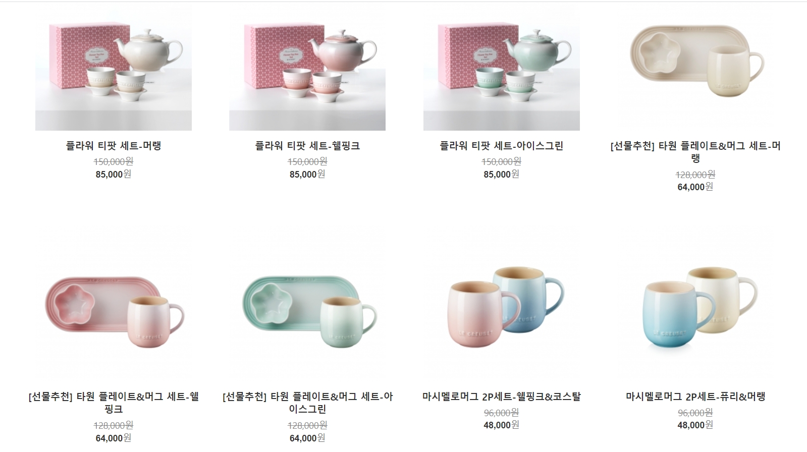 보기만 해도 기분이 정화되는 느낌이 들게 하는 온화한 느낌의 티팟 세트도 르크루제 세일에서 50% 넘게 할인 중입니다. 이 외에도 선물용으로 적합한 아기자기하고 귀여운 주방용품들이 준비되어 있으니 한번 둘러보시기 바랍니다.