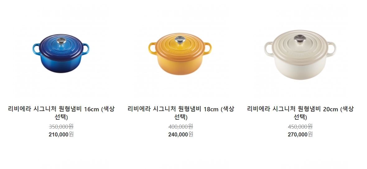 르크루제 명성을 널리 알리게 해 준 르쿠르제의 특별한 냄비 또한 사이즈 별로 세일 품목에 포함되었습니다. 각각의 품목을 클릭하시면 색상을 고르실 수 있습니다. 혹시나 품절로 나오신다면 회원 가입 후 로그인 하시면 잔여 수량이 표시되므로 놀란 마음을 진정시키고 쇼핑하시기 바라겠습니다.