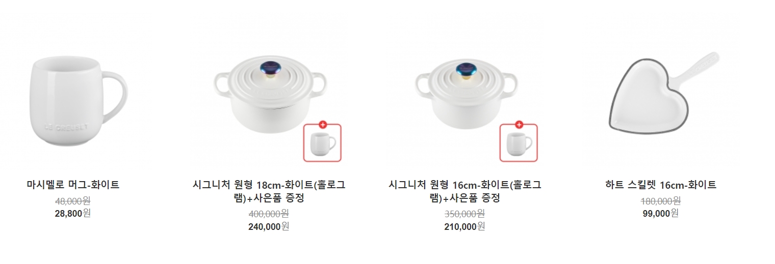 보기만 해도 시원한 느낌의 화이트 톤의 제품들은 이번 르크루제 세일 품목에 포함되었습니다. 르크루제의 인기 제품인 냄비 16cm, 18cm의 냄비와 귀여운 하트 스킬렛 제품이 대폭 세일 중입니다.