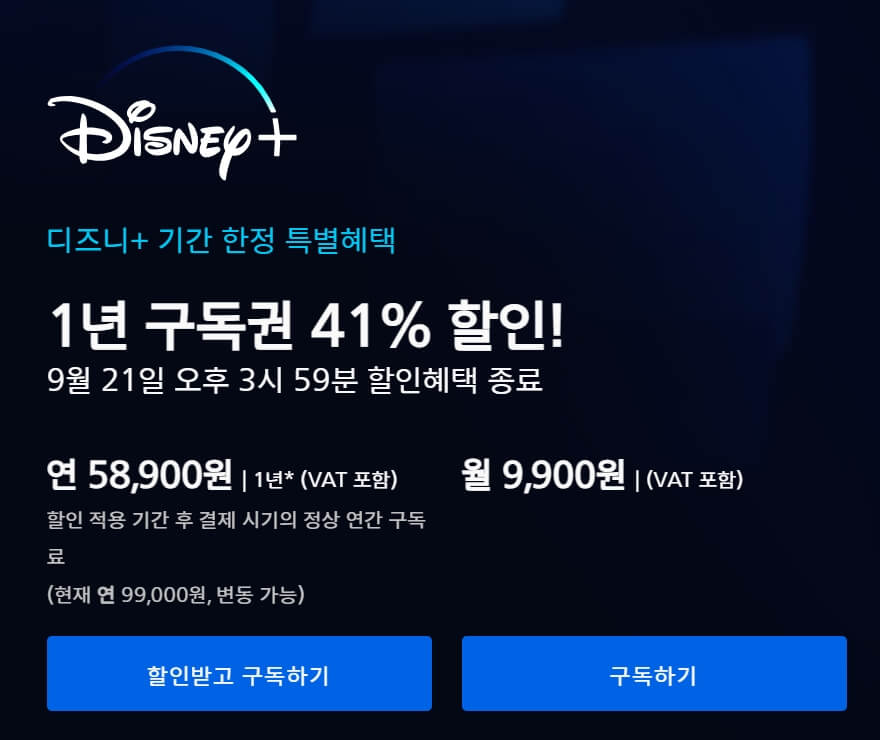 무빙의 인기를 등에 업고 디즈니플러스가 핫한 OTT로 부상하고 있습니다. 9월 21일까지 1년 구독권이 무려 41% 할인된 58,900원으로 구독이 가능합니다. 또한 11월 1일부터는 요금 인상이 예정되어 있기 때문에 앞으로 디즈니플러스를 보고 싶으신 분들은 가입을 서두르시는 것이 좋겠습니다.