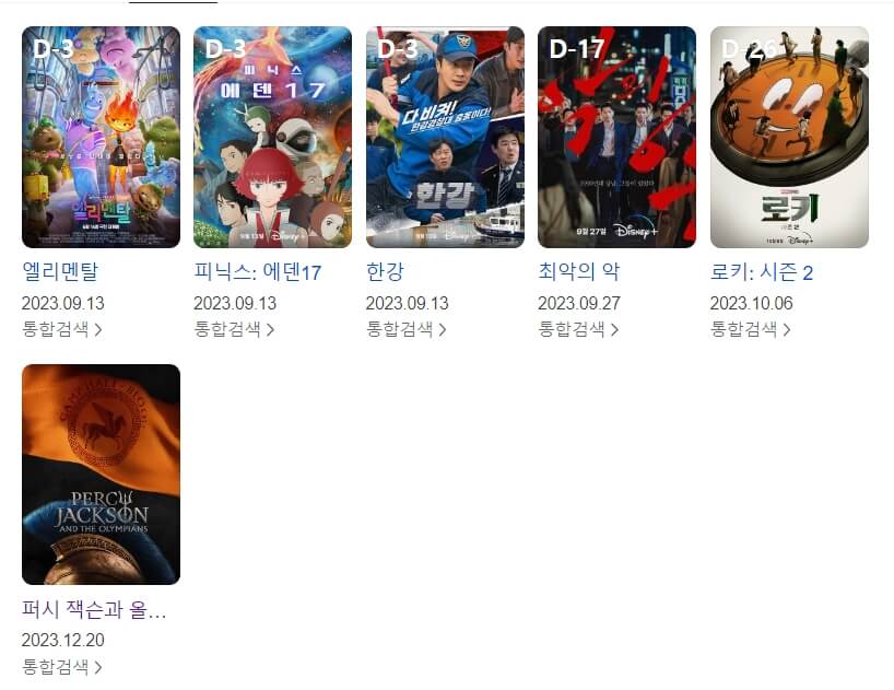 올해 화제작이었던 엘리멘탈이 9월 13일에 공개예정으로 되어 있습니다. 같은 날 드라마 한강도 공개예정입니다. 개인적으로는 작년 꽤 재미있게 봤던 미드 로키 시리즈가 시즌 2로 돌아옵니다. 로키 시즌2는 10월 초에 공개예정이며, 퍼시잭슨 시리즈가 드라마로 제작되어 12월에 선보일 예정입니다.