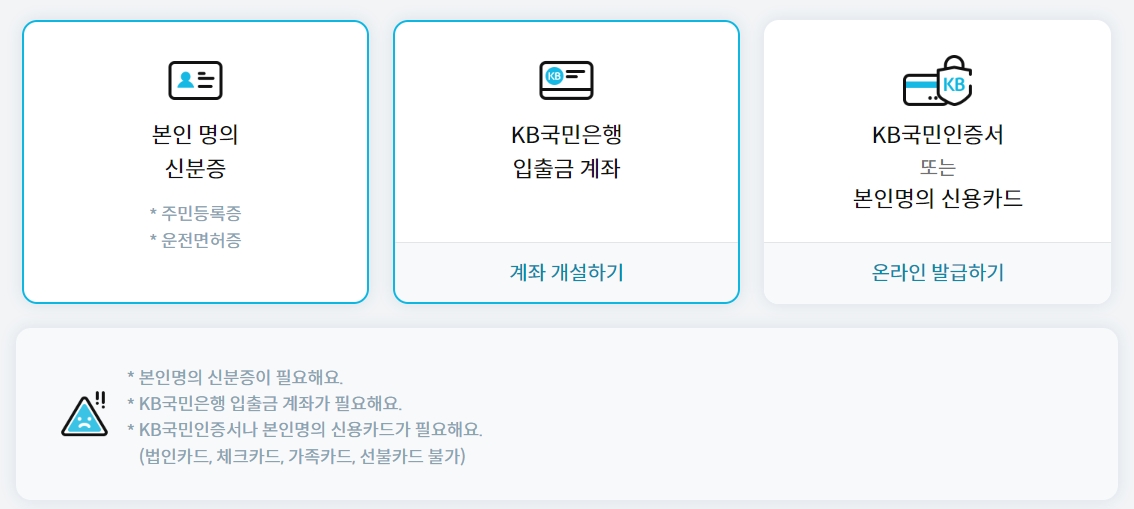 홈페이지에서 유심수령 신청 또는 가까운 KB국민은행 영업점에서 유심 수령→ 가입정보 입력→관련서류 파일첨부→개통절차 진행