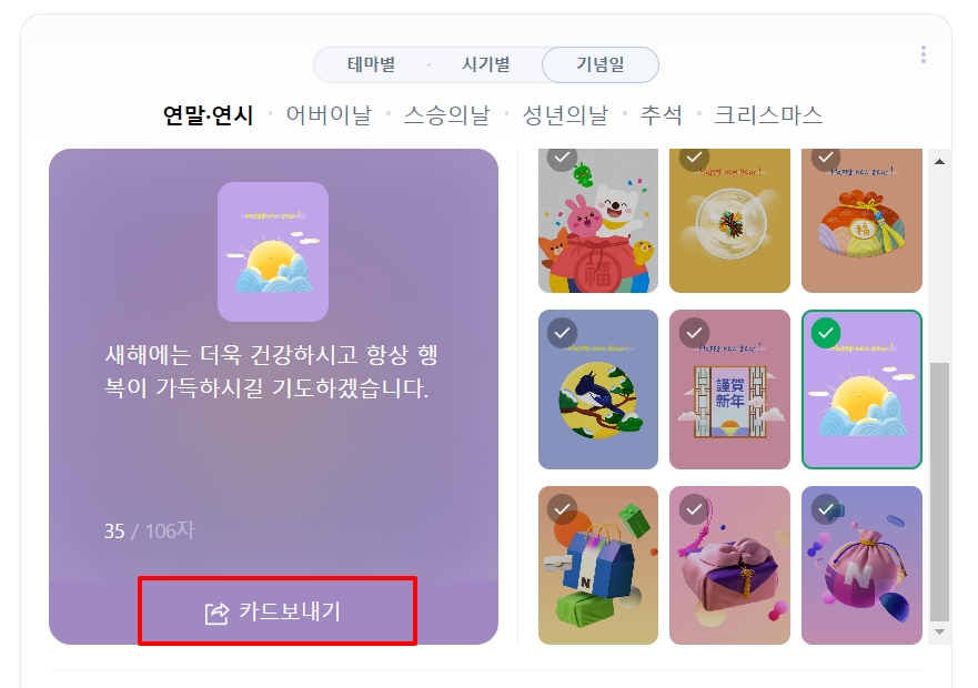 새해 인사말 카드는 기념일-연말연시 란에 있습니다. 직접 쓰기 란을 클릭해서 메시지를 직접 작성하셔도 됩니다. 보낼 수 있는 메시지의 양은 최대 106자이어서 다른 곳에 비해 넉넉한 편입니다. 메시지 작성이 어렵다면, 하단의 AI 문구란은 활용해 보세요.