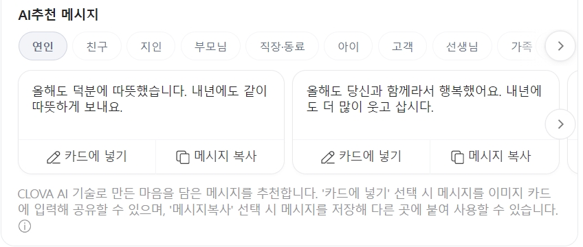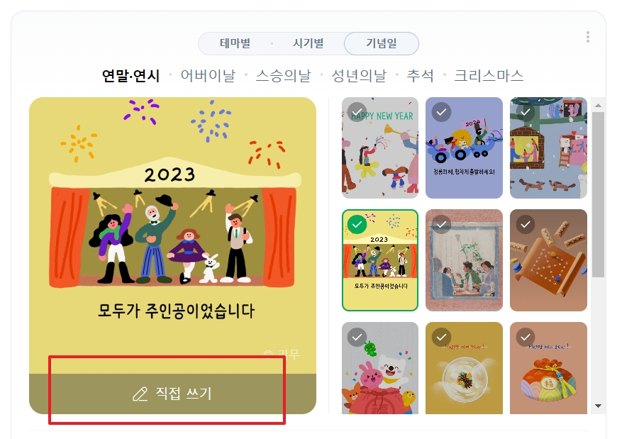새해 인사말 카드는 기념일-연말연시 란에 있습니다. 직접 쓰기 란을 클릭해서 메시지를 직접 작성하셔도 됩니다. 보낼 수 있는 메시지의 양은 최대 106자이어서 다른 곳에 비해 넉넉한 편입니다. 메시지 작성이 어렵다면, 하단의 AI 문구란은 활용해 보세요.