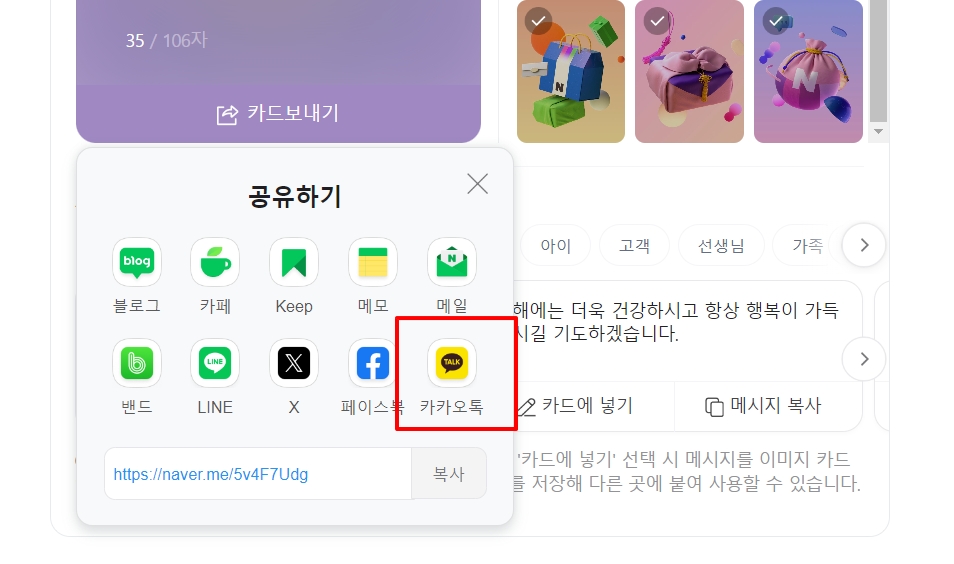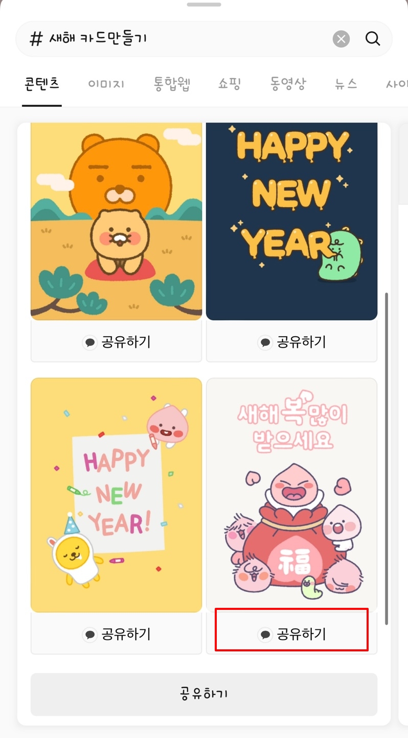 3. 클릭하면 나오는 카드 보내기로 나오는 디자인이 4가지가 있습니다. 이 중에서 고른 후 공유하기를 누르시면 됩니다.