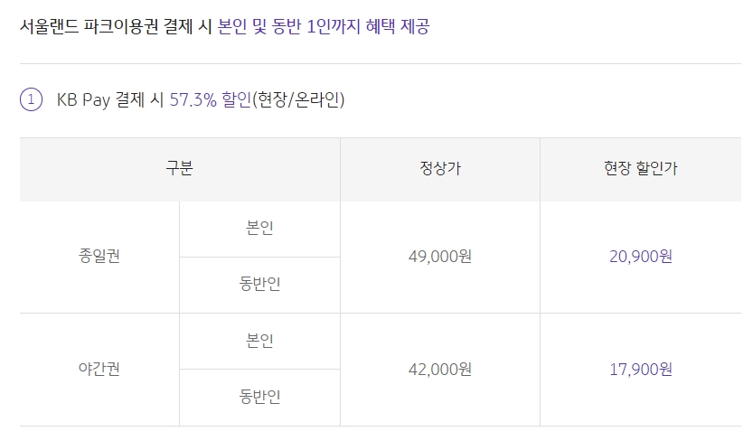 국민카드 KB Pay 앱으로 결제 시에 최대 57.3% 할인된 20,900원에 서울랜드 종일권을 구매할 수 있습니다. KB Pay 앱에 국민카드를 등록시켜 놓으면 바로 결제가 가능한 기능입니다.