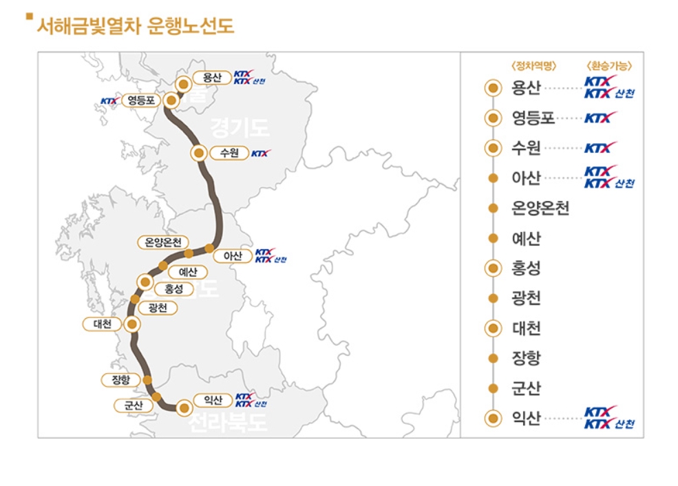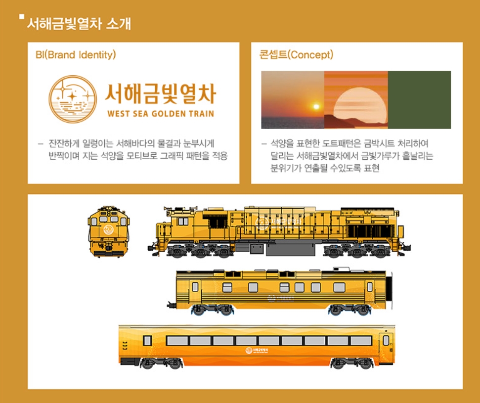서해 금빛열차는 3월부터 11월까지만 운행하는 비정기 열차입니다. 이 열차의 특징은 첫째, 외관이 일반 열차에 비하여 금빛이며, 온돌마루 열차가 있다는 것입니다. 총 5량의 객차 중에서 1량은 내부가 일반 좌석이 아닌 온돌마루로 되어 있습니다.