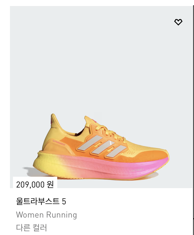 같은 가격대의 아디제로 타쿠미센은 쿠폰 적용 제외제품임에도 불구하고, 울트라 부스트는 같은 가격이지만, 세일 제품에 들어갑니다. 이번에 새롭게 출시된 울트라부스트 5는 색상만으로도 눈길을 사로잡습니다.