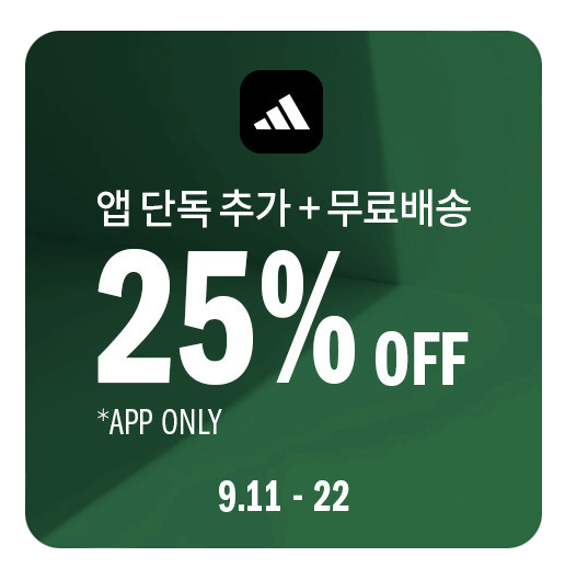 이번 아디다스 세일은 9월 11일부터 19일까지 진행되며, 앱에서 할인을 받을 수 있습니다. 할인을 받을 수 있는 최저 금액이 25만 원이기 때문에 금액 미만은 큰 의미가 없다는 것을 알아두시기 바랍니다. 25만원 이상 결제 시에 앱 할인코드인 APP25를 넣고 적용을 하셔야 25% 할인을 받을 수 있다는 사실! 꼭 알아두시기 바랍니다.