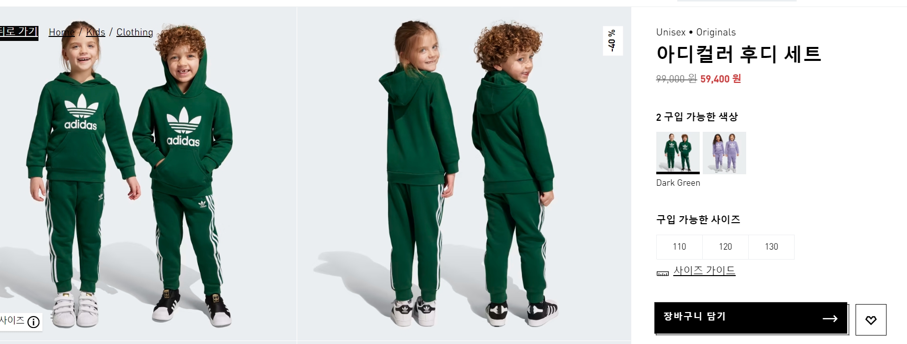 오징어 게임을 연상케 하는 카키색의 후디 세트 또한 이번 아디다스 세일 품목에 포함되었습니다. 짙은 카키색과 연보라색 두 가지 색이며 만 5세까지 착용가능한 사이즈까지 나와 있으니 구매에 참고하시기 바랍니다.