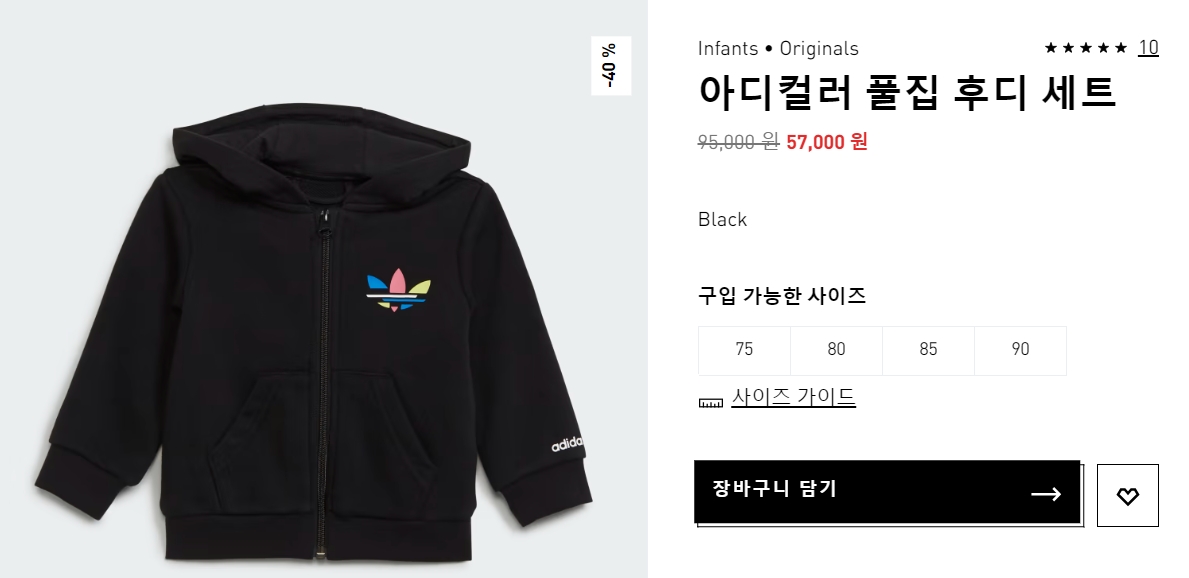 아디컬러 풀집 후디 세트(바지포함)이 세일가 57,000원에 아디다스 홈페이지에서 판매 중입니다. 아장아장 걷는 아이들에게 어울릴 법한 이 옷은 가을 겨울 대비 요긴한 패션 아이템으로 쓰일 것입니다.