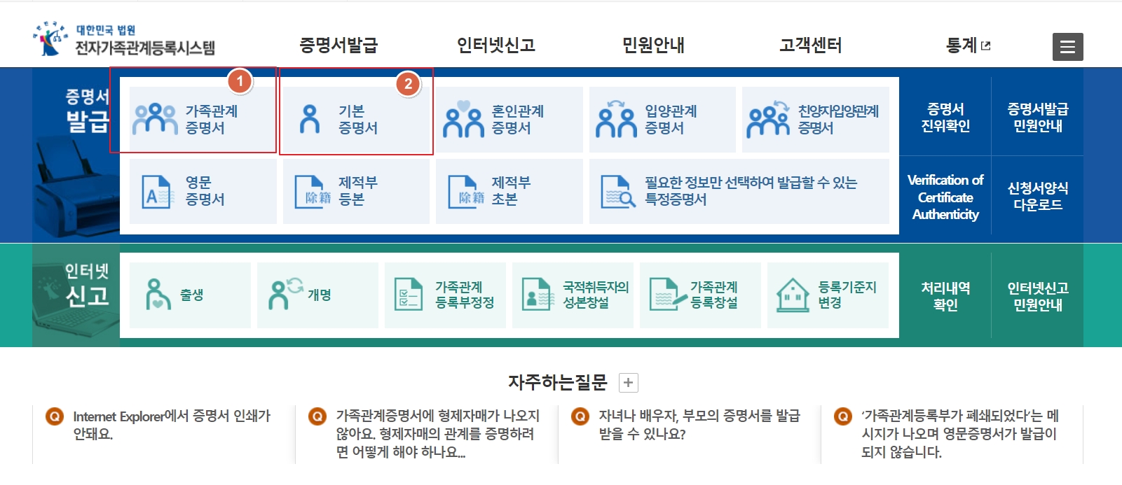 ①가족관계증명서 /기본증명서: 대법원 가족관계등록시스템