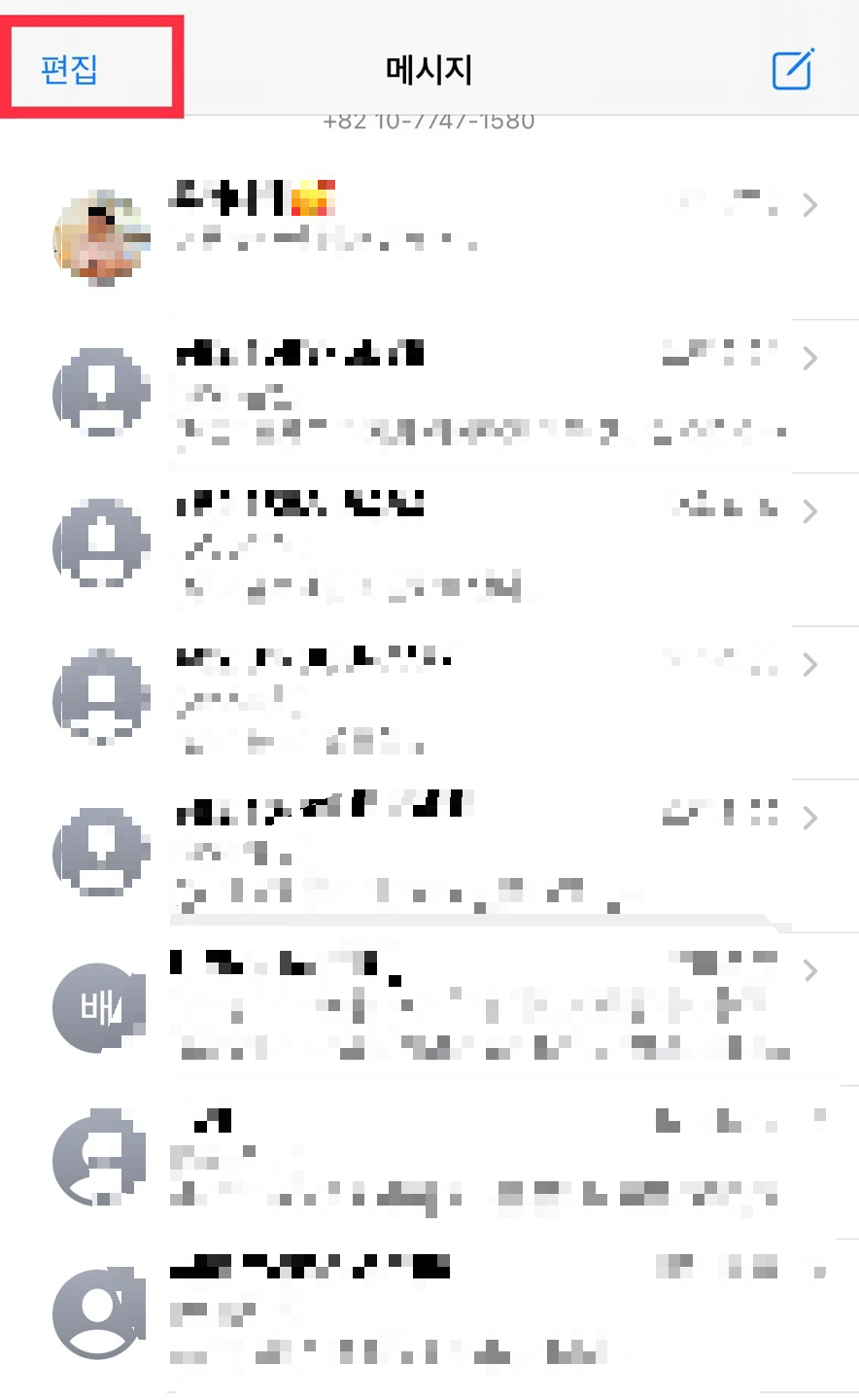 화면에서 메시지앱 열기- 왼쪽 상단 편집 버튼 클릭-