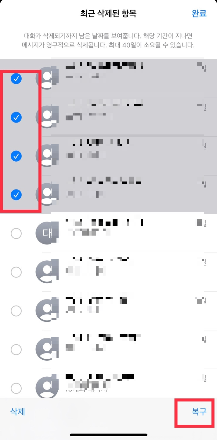 클릭하여 복구할 메시지 선택- 복구버튼 클릭