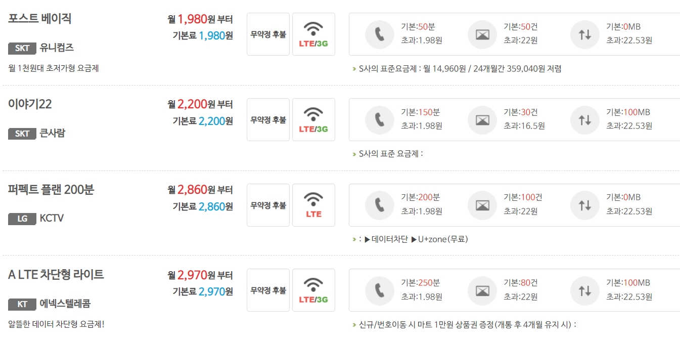 요금제선택 - 우체국알뜰폰