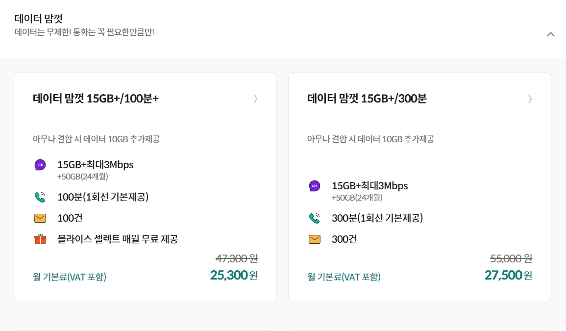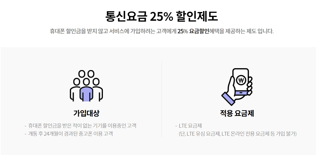 다른 업체들과 제휴를 통한 다양한 결합 요금제가 있으며, 특정 요금제에 대한 25% 약정 할인이 가능합니다.