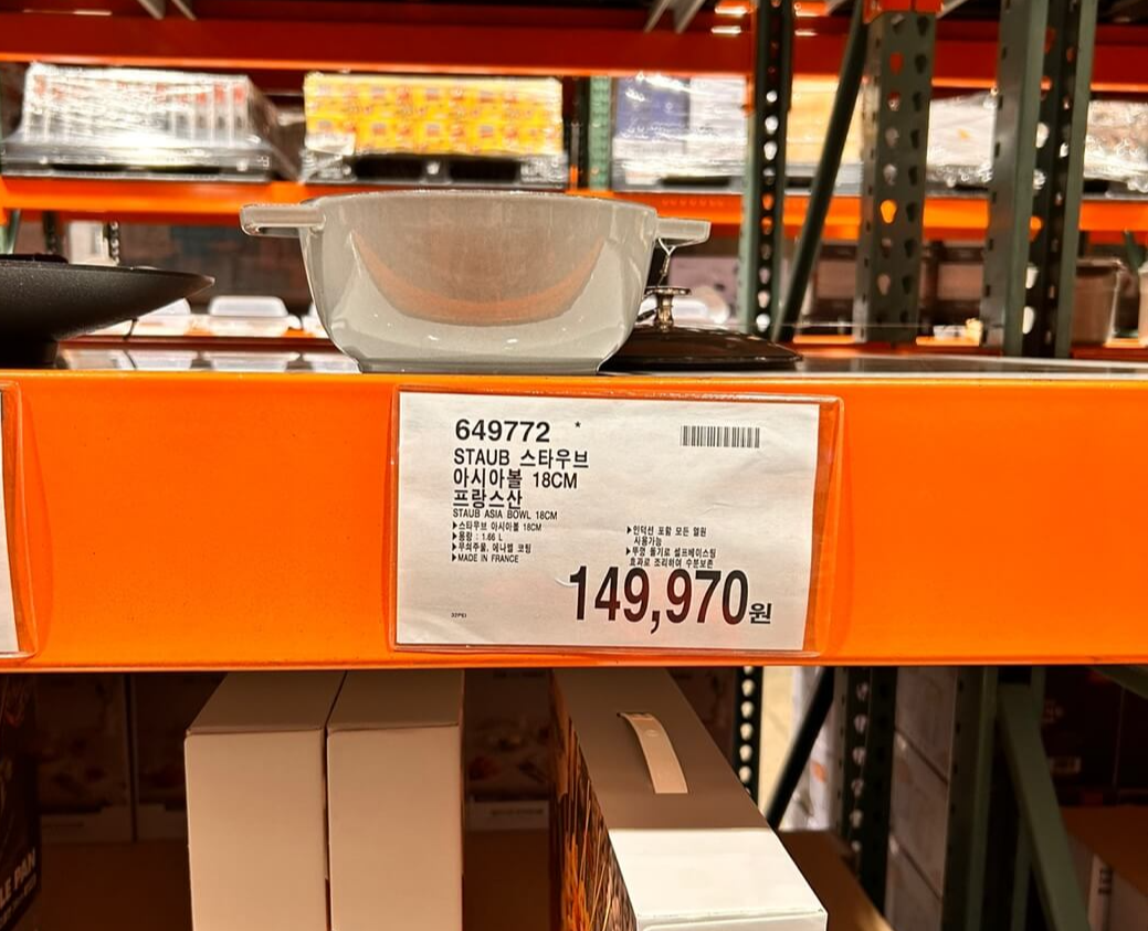 요리 좀 한다면 가지고 있다는 스타우브 냄비는 제가 코스트코 방문 할 때마다 체크하는 품목입니다. 이날 추석 다음날이라 재고를 다 채워놓지 못해서인지 어째 스타우브 샘플 냄비만 덜렁 있었습니다. 재고가 있었다면 저도 샀을지도 모르겠습니다. 구매예정이시라면 양재 코스트코에 먼저 재고 문의 후 방문해 보시기 바랍니다. 가격은 인터넷 최저가보다도 5만 원 이상 저렴한 149,970원입니다.