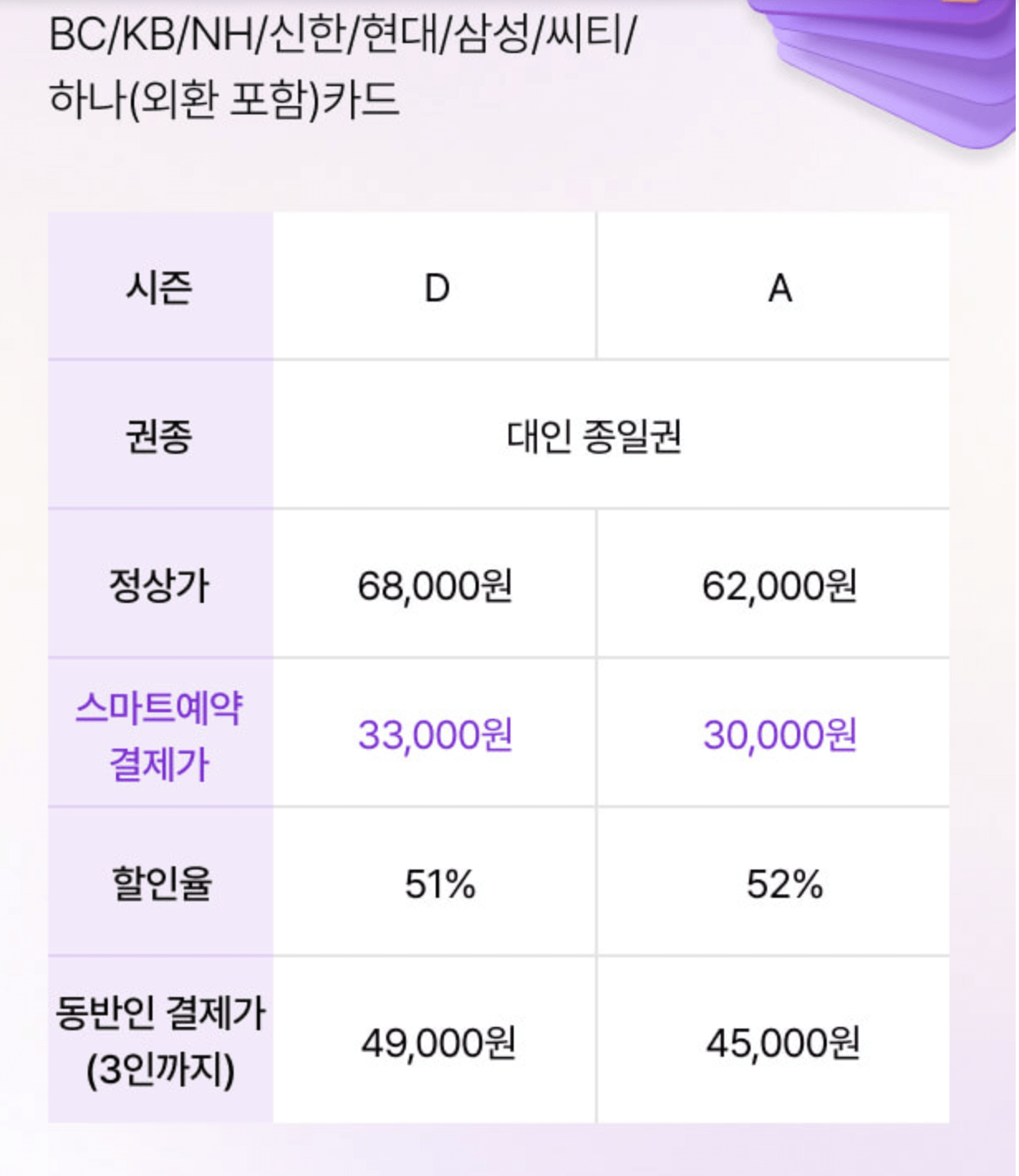 삼성카드 소지자는 스마트 예약과 현장 매표소에서 각 1장씩 할인된 금액으로 티켓을 구매할 수 있습니다.