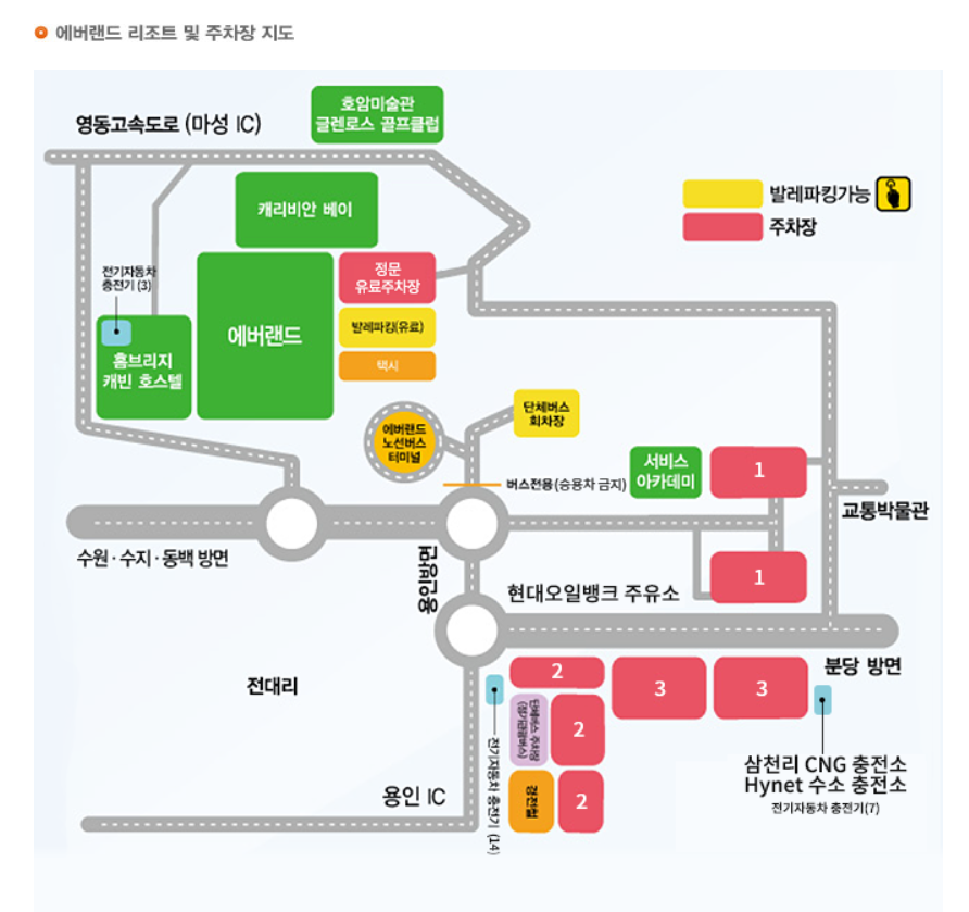 내비게이션에 에버랜드 주소(경기 용인시 처인구 포곡읍 에버랜드로 199) 입력 후, 아래 주차장에 주차하세요.