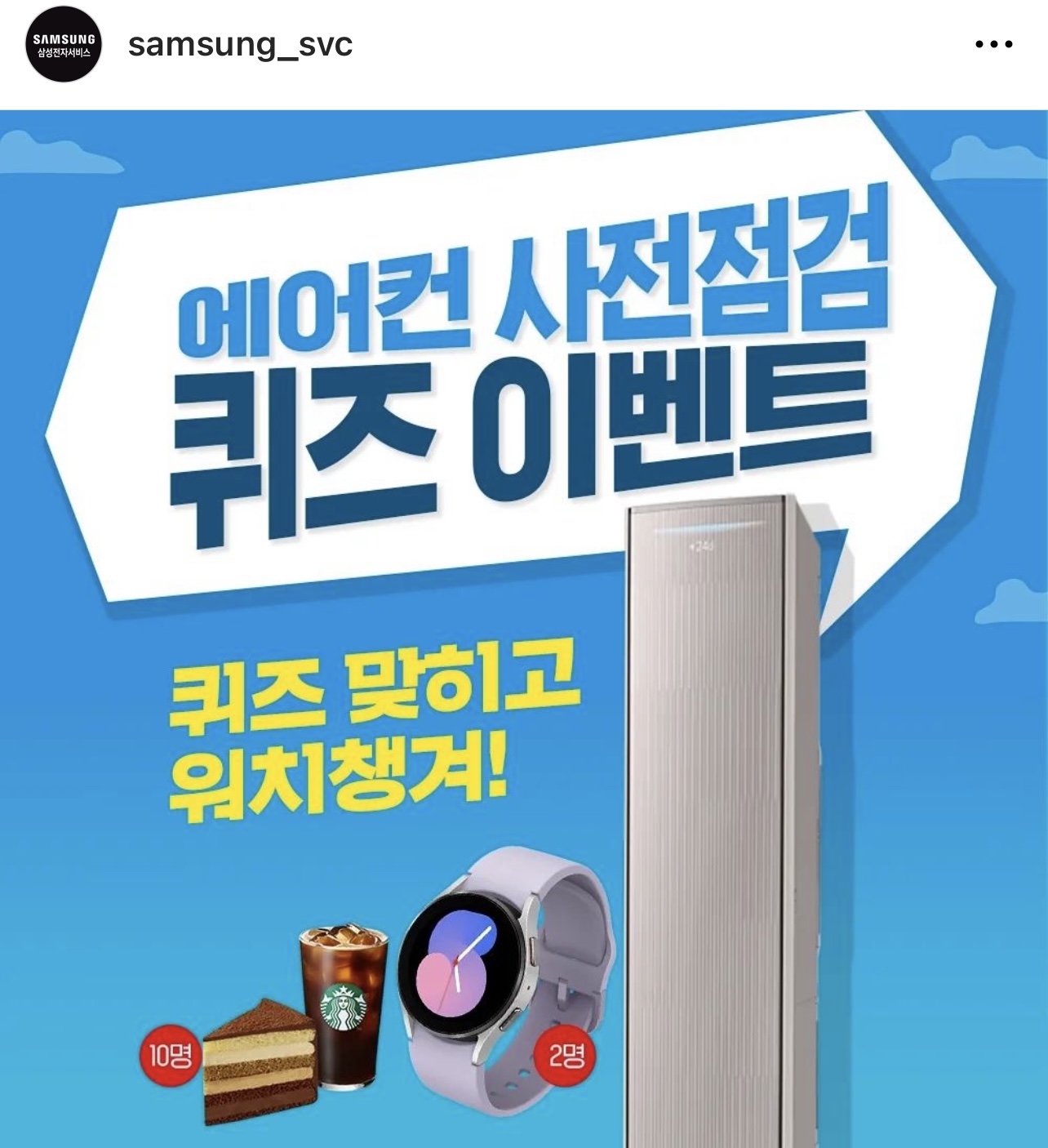 에어컨 사전점검 관련하여 삼성전자 서비스 인스타그램에서 퀴즈 이벤트도 진행 중입니다. 팔로우하고 정답을 맞히면 소정의 상품이 지급되니 관심 있는 분들은 참여하시기 바랍니다.