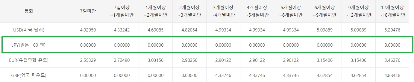 엔화는 외화예금에 넣어 두어도 거의 금리가 없는 상태입니다. 국민은행에 현재 고시된 외화별 금리를 살펴보면, 엔화의 경우 제로 금리에 가깝습니다.