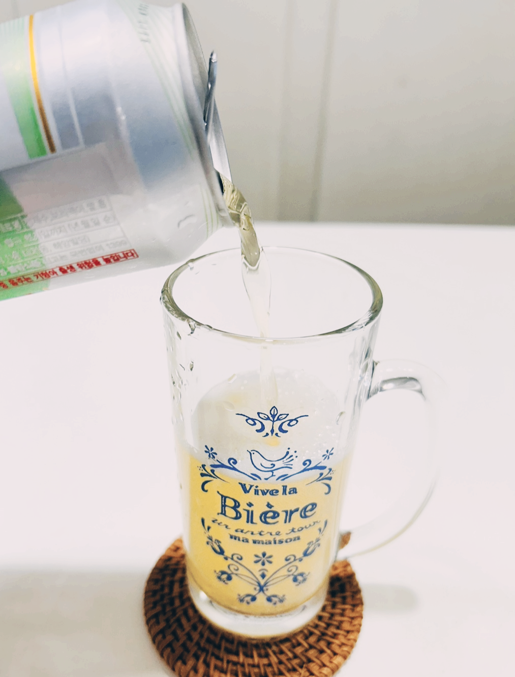다음 시도에서는 연태고량주의 양을 절반 20ml로 줄이고 나머지는 맥주로 채웠습니다. 그러니 향이 좀 더 은은해지면서 부담없이 즐길 수 있는 도수가 되었습니다. 연맥 황금 비율은 소맥을 만들 때보다 소주의 양보다 연태 고량주의 양을 좀 더 적게 넣어야 한다는 것을 알게 되었습니다.
