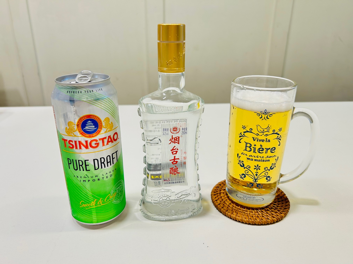 연맥 제조를 위한 준비물은 연태 고량주와 칭따오(맥주), 그리고 비율을 위해 대략적으로 계량이 가능한 소주잔(필수조건이 아님), 맥주잔입니다.