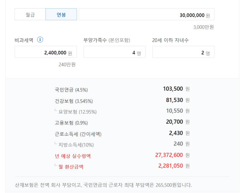 연봉 3000만원의 월 실수령액은 225만원입니다. 이는 본인 혼자 부양한다는 조건이며, 부양가족이 본인 포함 2명인 경우에는 약 7천 원가량이 늘어납니다.