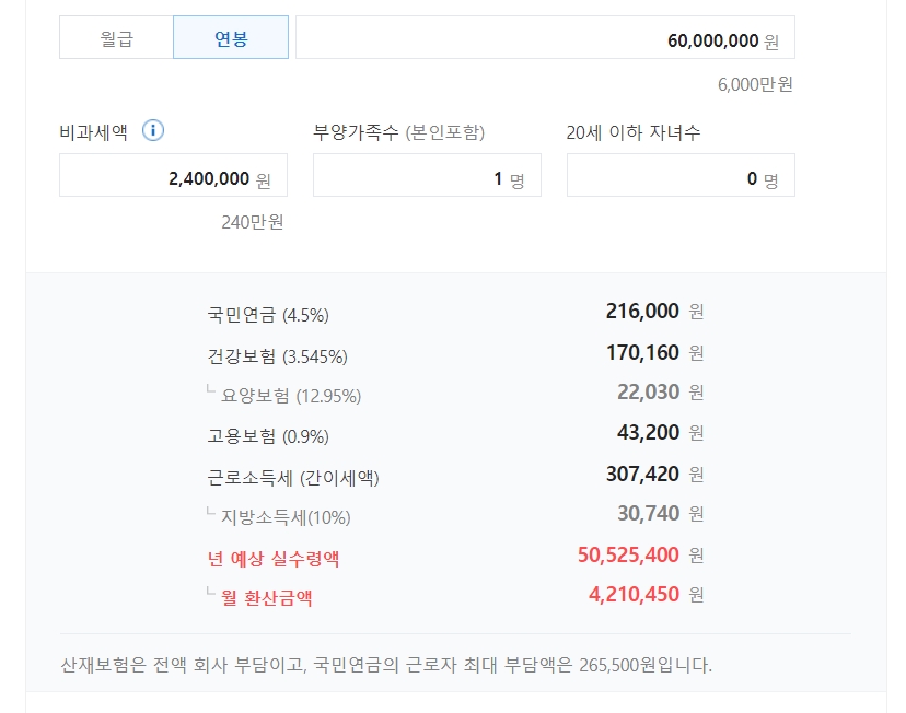 연봉 6천만원대가 되면 월 실수령액이 400만 원이 넘어갑니다. 1인 부양가족인 경우에 국민연금 납부 금액은 무려 20만 원이 넘어가고 근로소득세도 30만 원이 넘어가게 됩니다. 월 실수령액 금액은 421만 원이 됩니다. 부양가족이 1명인 경우 근로소득세는 1인 부양가족보다 10% 할인된 금액으로 실수령액은 424만 원이 됩니다.