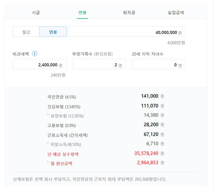 연봉 4000만원의 월 실수령액은 부양가족 1명 기준으로 294만 원가량임을 알 수 있습니다. 부양가족이 한 명 더 있을 경우에는 만원이 늘어난 296만 원이 됩니다.