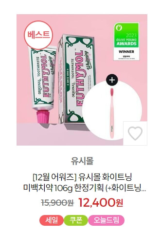 커피나 와인 등을 마시는 분들은 점점 치아 색의 변화를 느끼실 텐데요. 웃을 때마다 노랗게 변한 치아가 신경쓰이신다면 유시몰 화이트닝 미백치약을 올영 세일에서 구매해 보세요. 기존 가격보다 3천 원 할인된 가격으로 구매하실 수 있습니다.